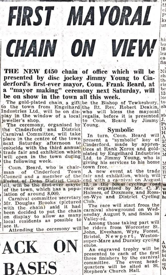If you would like to invite the Mayor of Cinderford to your event, please contact Cllr Roger Sterry by emailing roger.sterry@cinderfordtowncouncil.gov.uk or by calling 01594 825022. Information on the Cinderford Mayoral Chain can be seen in the historical press articles below.